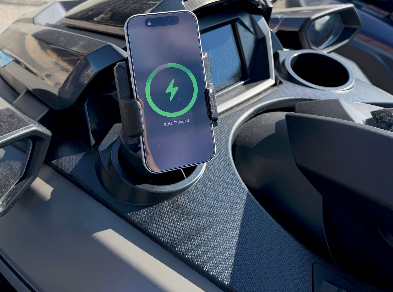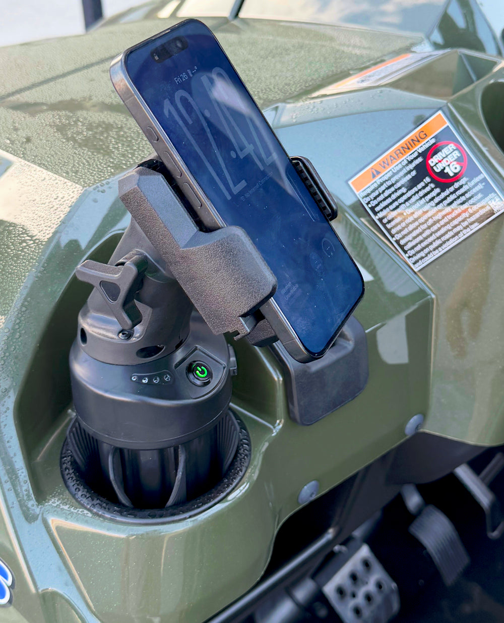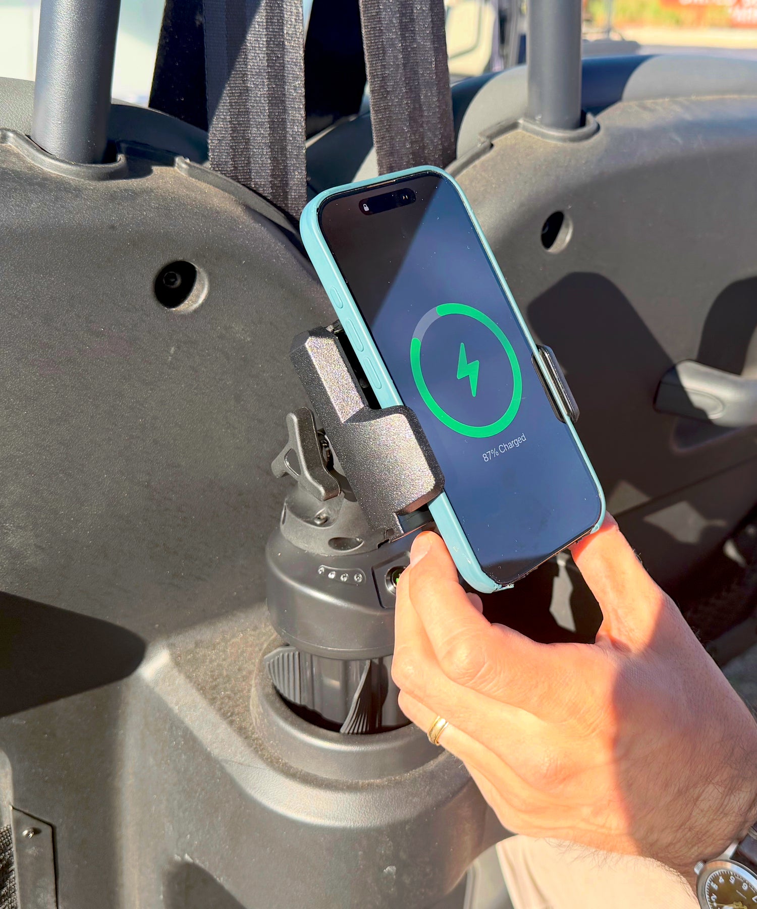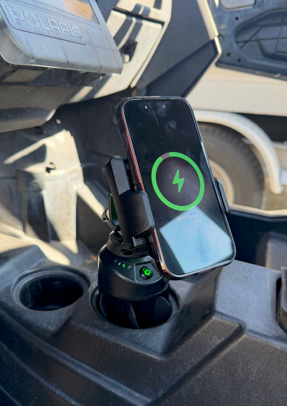 Battery-powered waterproof wireless phone charger for off-road cup holders.