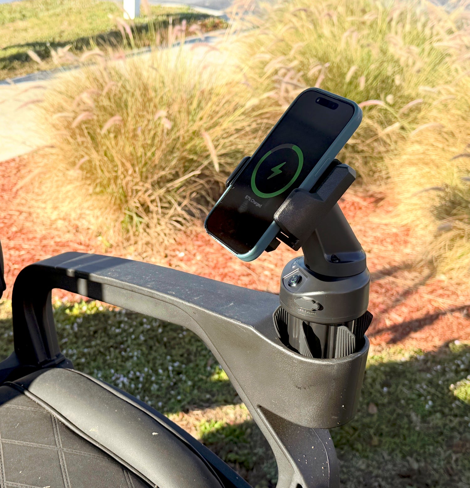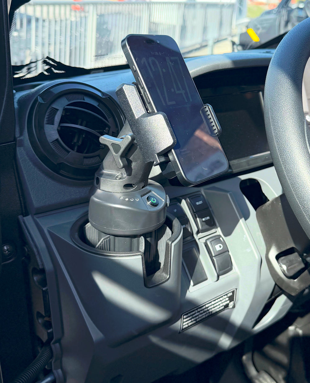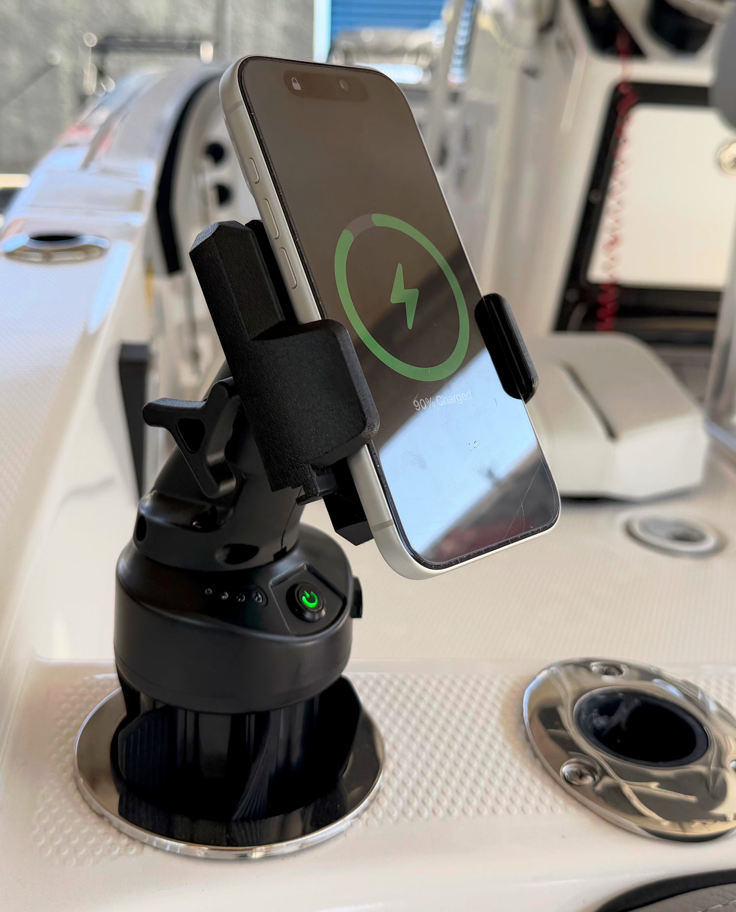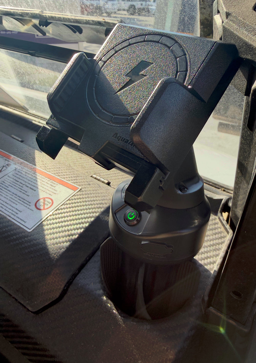 Battery-powered waterproof wireless phone charger for off-road cup holders.